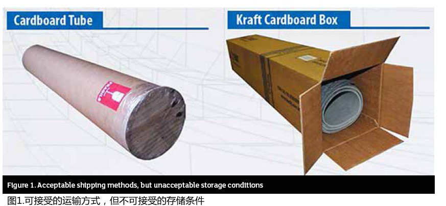 請(qǐng)注意,特別是對(duì)于彈性體粘合纖維片材,盡管盒子和紙管是經(jīng)批準(zhǔn)的以卷材形式運(yùn)輸片材的方法,但它們不應(yīng)在任何情況下用作長(zhǎng)期存放(參見圖1)。