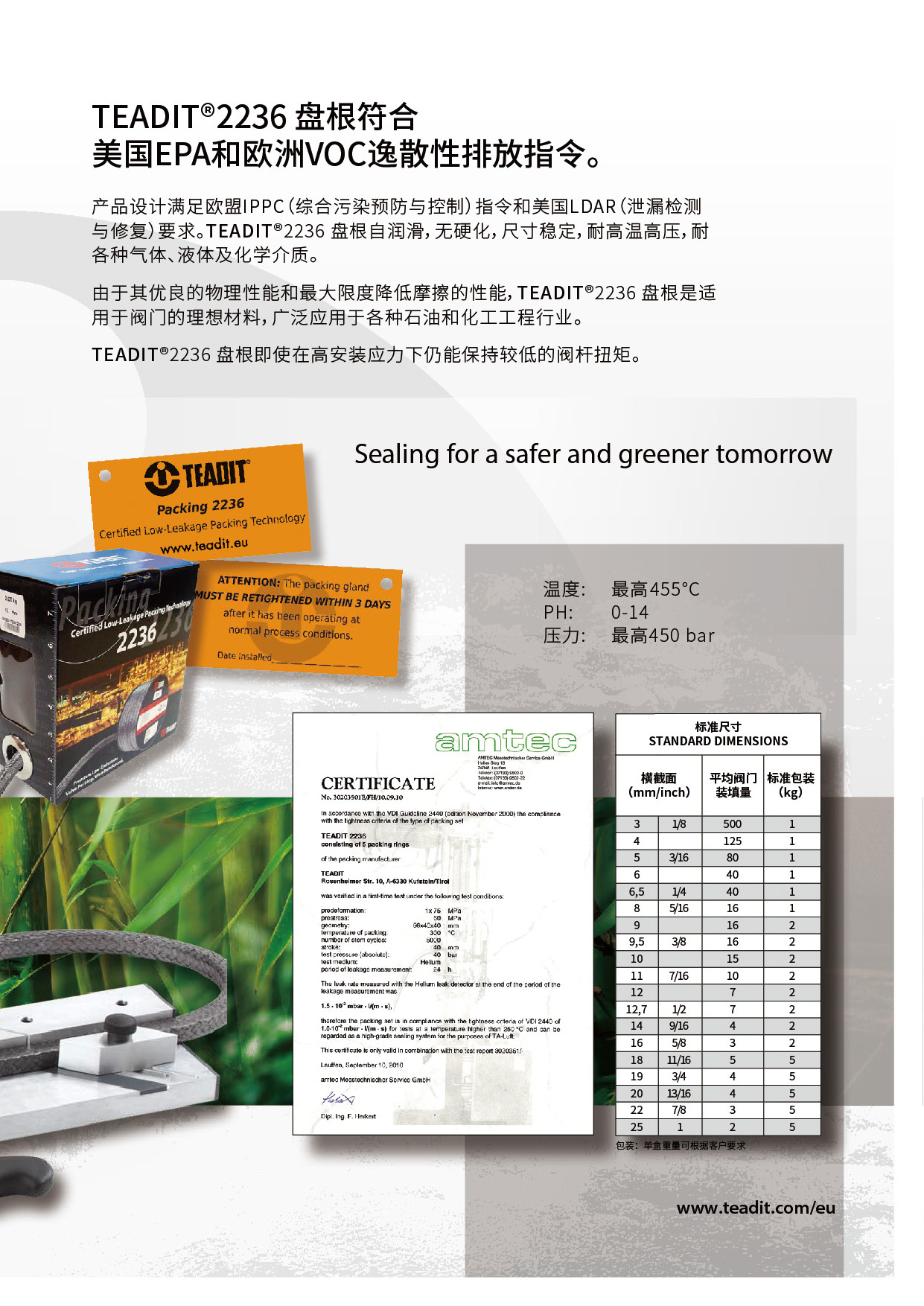 TEADIT® 2236 盤(pán)根具有自潤(rùn)滑、非硬化、尺寸穩(wěn)定、耐氣體和流體、耐熱、耐壓和耐化學(xué)腐蝕等特性。它的高溫柔性石墨和 Inconel® 長(zhǎng)絲護(hù)套具有機(jī)械穩(wěn)定性,先進(jìn)的結(jié)構(gòu)可在蒸汽服務(wù)中實(shí)現(xiàn)泄漏控制和高完整性。產(chǎn)品設(shè)計(jì)滿(mǎn)足歐盟IPPC(綜合污染預(yù)防與控制)指令和美國(guó)LDAR(泄漏檢測(cè)與修復(fù))要求。